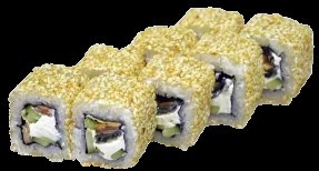 (рис, нори, сливочный сыр, жареный лос жареный лосось, ог ось, огурец ,салат урец ,салат, кунжу , кунжут,) 230 гр., 738 Ккал